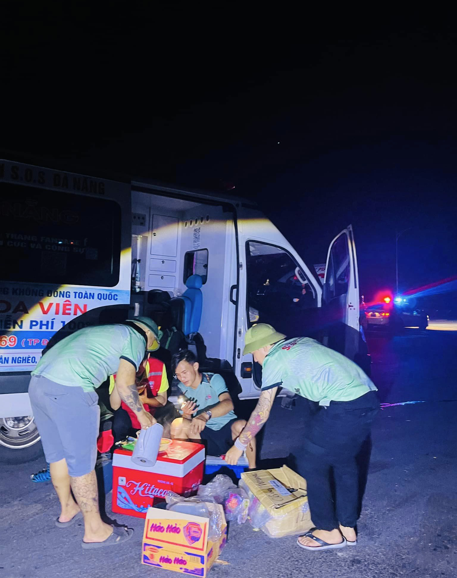Bữa ăn dã chiến của đội SOS Đà Nẵng dọc đường đi cứu trợ - Ảnh: NVCC